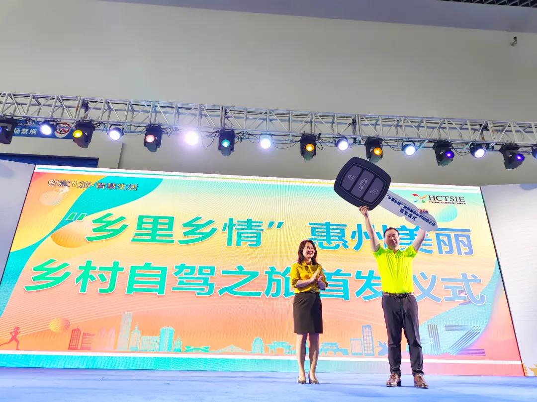 ▲惠州市文化廣電旅游體育局黨組書記局長鐘亮為“鄉(xiāng)里鄉(xiāng)情”惠州美麗鄉(xiāng)村自駕代表頒受啟動鑰匙